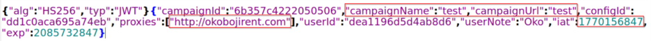 The JWT includes an issued-at timestamp (iat) of 1770156847. Converted from Unix epoch, that corresponds to Tue 3 February 2026 22:14:07 UTC. This timestamp is useful for correlating infrastructure activity, staging events, and the approximate timeline of when this configuration or campaign token was generated.