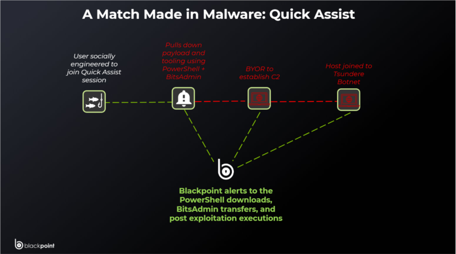 The Blackpoint Response Operations Center (BROC) recently responded to an intrusion that converted a socially engineered Quick Assist session into a staged, multi-path execution pipeline. The key theme across the observed activity is optionality. The attacker did not rely on one dropper or one execution method. Instead, they established interactive control through a trusted support channel, then staged multiple artifacts that each served a distinct role: immediate code execution, packaged script-based delivery, and a runtime-enabled orchestration layer that could flex based on what the endpoint allowed.