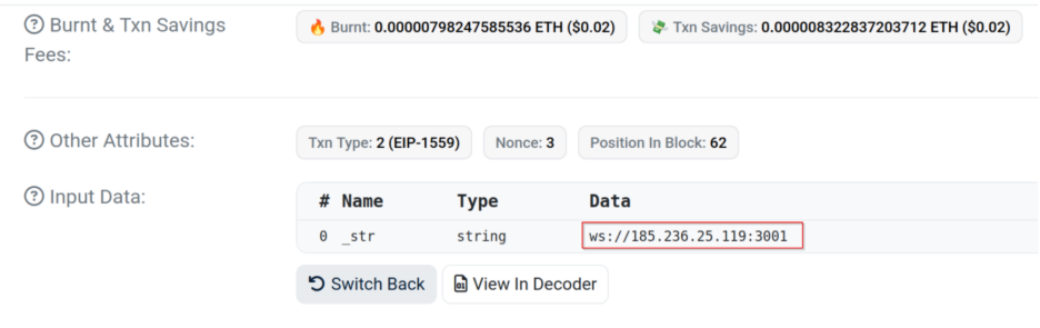 Reviewing the associated contract activity in Etherscan shows three prior transactions. More importantly, the transaction input data can be decoded to recover the botnet’s downstream Command –and –Control (C2) details. In this case, decoding reveals a WebSocket endpoint that the malware uses as its C2 address, effectively treating the contract as a resolver that publishes where infected hosts should connect next.