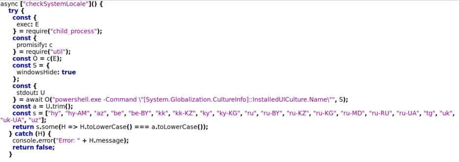 The locale gate further supports attribution to Tsundere Netto tradecraft because it behaves like a targeting decision, not just a generic sandbox check. Before the implant retrieves infrastructure details or opens a WebSocket session, it checks the system’s installed UI culture, which is the operating system language and regional setting used to present menus, dialogs, and interface text. It then compares that value against a denylist of locales commonly associated with CIS and nearby regions and exits immediately when there is a match.
