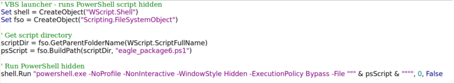 Serial.msi behaves less like a legitimate installer and more like a delivery container for a quiet launcher chain that can run under the user’s context. Based on the updated artifacts, the MSI drops a small VBScript wrapper, Falcon13.vbs, whose only purpose is to start PowerShell in a hidden window with profile loading disabled and execution policy bypassed, then hand off to a local script, eagle_package6.ps1.