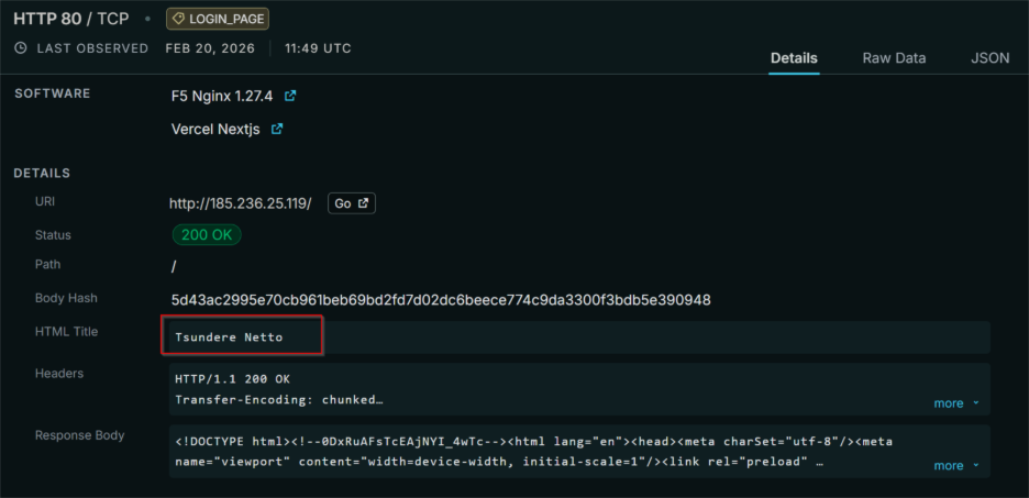 Image showing Censys.io results for C2. HTML panel shows the telltale Tsundere Netto title