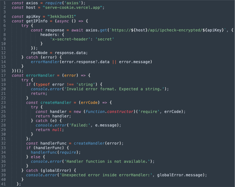 When the catch block runs it issues an HTTP request to an operator-controlled endpoint at serve-cookie[.]vercel[.]app, calling /api/ipcheck-encrypted/<apiKey> with a custom header. The loader assigns the response to a local variable and then compiles and invokes the returned string as JavaScript with require passed into its scope, turning the remote response into executable code on the host. This try/fail design converts ordinary error handling into a stealthy staging and execution channel, because the visible repository remains largely benign while the remote response performs the malicious work (Figure 2).