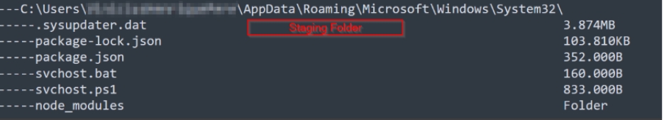 As part of the trojanized install the malware created a fake System32 directory under the user’s %AppData%\Roaming path and used it as the central workspace for execution and persistence. Into that location the actor placed svchost.bat, svchost.ps1, package.json / package-lock.json, a populated node_modules tree, and the obfuscated JavaScript payload .sysupdater.dat, which together form the loop that launches and maintains the stealer execution (Figure 3).