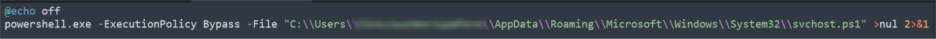 The on-disk loop begins with execution of svchost.bat, a small file that acts as the execution primer. This script repeatedly calls PowerShell with -ExecutionPolicy Bypass, redirects all output to null, and runs svchost.ps1 from the staging folder (Figure 4). Its purpose is simply to ensure the PowerShell stage is executed reliably on every logon while producing almost no visible activity. Coupled with the WindowsUpdate Run key, svchost.bat guarantees the loop will restart automatically, making the overall activity resilient even if the Node process itself is killed.