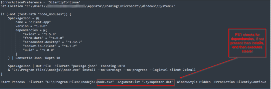 The svchost.ps1 script is the primary engine behind the execution loop. Each run sets the working directory to the fake System32 staging folder, checks for a node_modules directory, and if dependencies are missing it writes package.json and performs an unattended npm install to restore the runtime environment before launching the stealer, making the loader self-healing and resilient to basic cleanup attempts (Figure 5). Because the script validates and rebuilds its Node environment on each invocation, svchost.ps1 guarantees the loop can recover from file deletion or process termination and reliably hands control to the primary JavaScript payload in a hidden window.