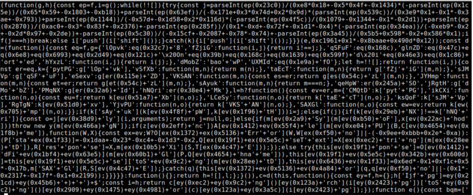 After staging, svchost.ps1 launches node.exe with .sysupdater.dat as the argument via a hidden Start-Process, handing runtime control to Node while keeping the process windowless. The active stealer logic lives entirely in .sysupdater.dat, a heavily obfuscated JavaScript payload interpreted by Node (Figure 6).