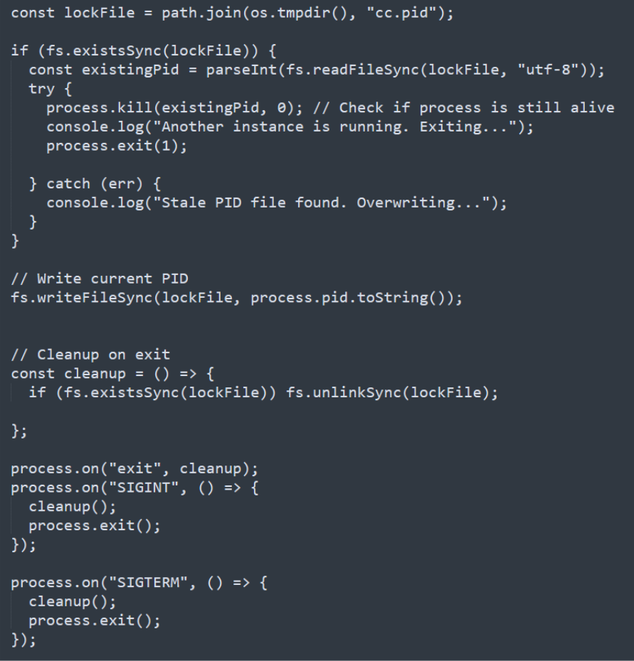 The stealer enforces single instance execution by creating a lock file named cc.pid in the system temp directory (Figure 8). On startup it checks for the presence of cc.pid; if the file exists, the saved PID is read and probed with process.kill(pid, 0) to test whether the process is still alive. If an active process is found, the stealer logs the condition and exits to avoid running a duplicate instance. If the PID is stale, execution continues, and the file is updated with the new process ID. To manage cleanup, the malware registers handlers for normal exit, SIGINT, and SIGTERM that remove the lock file before terminating, ensuring future runs can proceed without interference.