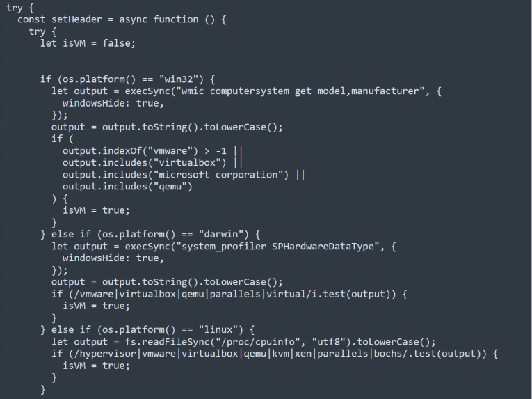 The stealer includes an async setHeader routine that fingerprints the host and determines whether it is likely running in a virtualized environment. On Windows the code runs wmic computersystem get model,manufacturer, on macOS it calls system_profiler SPHardwareDataType, and on Linux it reads /proc/cpuinfo; the returned text is lowercased and scanned for indicators such as vmware, virtualbox, qemu, kvm, xen, parallels, and bochs, and on Windows it also checks for microsoft corporation. When a match is found the payload sets an isVM flag to true (Figure 9).