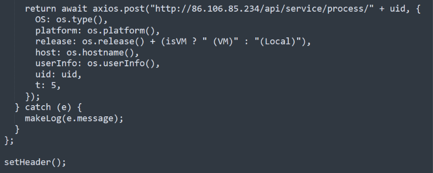 Network failures during registration are forwarded to makeLog(e.message) so errors are reported without interrupting execution. The loader calls setHeader() immediately on startup, making this registration the stealer’s first beacon and giving the operator a quick inventory of the host and its likely virtualization state (Figure 10).