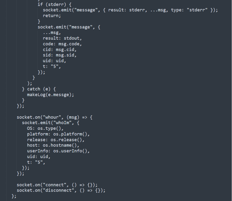 Figure 12: Socket event handlers enabling command execution and fingerprinting.