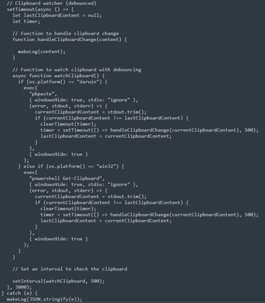 The stealer includes a clipboard watcher that passively taps copied data and sends changes to the operator (Figure 13). After a 3 second startup delay it enters a 500 ms polling loop, using pbpaste on macOS and Get-Clipboard on Windows to read the clipboard, trimming the result and comparing it to the last captured value. When a change is detected, it waits for a 500 ms debounce, then calls handleClipboardChange, which forwards the new clipboard text to the remote log via makeLog. On Windows the code hides spawned consoles and ignores stdio to minimize visible artifacts during polling, and a lastClipboardContent variable prevents duplicate submissions.