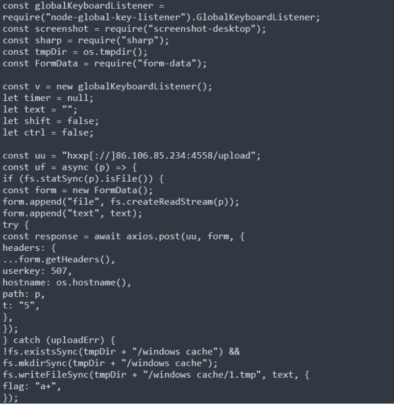 On key release tmp.js starts a 3 second debounce; when that timer fires it captures a desktop screenshot, resizes the image to a width of 1024 pixels, compresses it to JPEG at quality 60 using sharp, and writes the result to <tmp>/windows cache/2.jpeg (Figure 13). The code then uploads the JPEG and the current keystroke buffer to hxxp://86.106.85[.]234:4558/upload as multipart form-data, including headers such as userkey: 507, hostname, path, and t: “5”. If the upload fails the payload ensures the stash directory <tmp>/windows cache exists and appends the keystroke buffer to 1.tmp for later exfiltration. All these actions are guarded by broad try/catch blocks, so errors are suppressed, and the process continues running even if dependencies fail to install or individual steps error out.