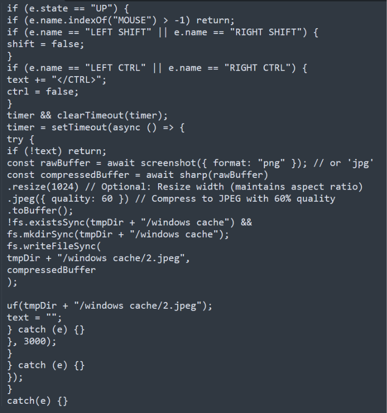 tmp.js mirrors elements of the main .sysupdater.dat payload while introducing its own capabilities (Figure 14). Similarly to the main payload, it sets the process title to “Node.js Javascript Runtime” to blend in with legitimate activity, then silently installs node-global-key-listener, screenshot-desktop, and sharp via npm with suppressed output. After a short delay it initializes a global keyboard hook and maintains a plaintext buffer called text that records keystrokes. The routine accounts for modifier keys like SHIFT and CTRL, translates input into characters, and tags special keys such as <TAB>, <BS>, arrow keys, and <CTRL>…</CTRL>, while ignoring mouse events.