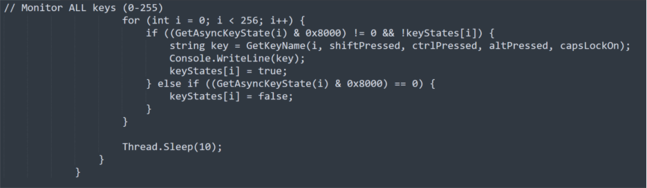 The PowerShell keylogger maintains a 256 element boolean array to track key-down state and reads modifier states (Shift, Ctrl, Alt, CapsLock), then polls every 10 ms across virtual-key codes 0-255 to detect fresh presses. On a new press it converts the virtual-key into a printable token using GetKeyName, applying Shift XOR Caps logic for letter case, mapping digits to their shifted symbols (for example 1 becomes ! when Shift is held), encoding function keys as [F1]…[F12], and normalizing navigation/control keys to tokens like [TAB], [ENTER], [BACKSPACE], and arrow names; numpad keys and punctuation are handled with appropriate shift variants. Each resolved token is emitted to standard output via Console.WriteLine, producing a readable stream of keystrokes for collection and exfiltration (Figure 17).