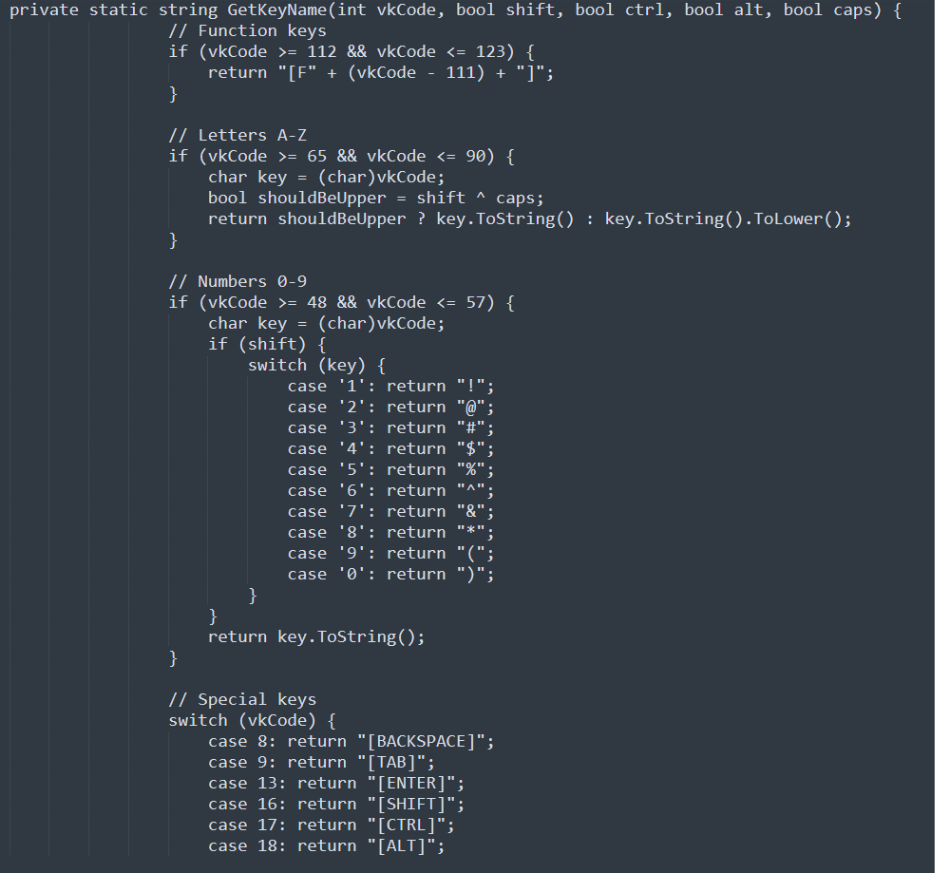 Figure 17: Keylogger logic converting virtual-key codes to printable tokens.