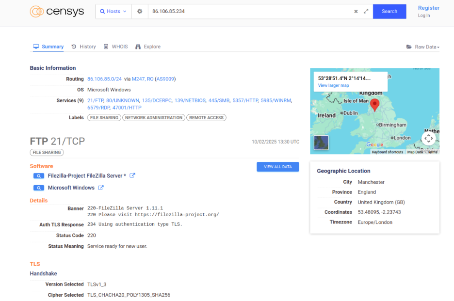 Figure 18: Censys result showing 86.106.85[.]234 hosted by M247 in Manchester, UK.