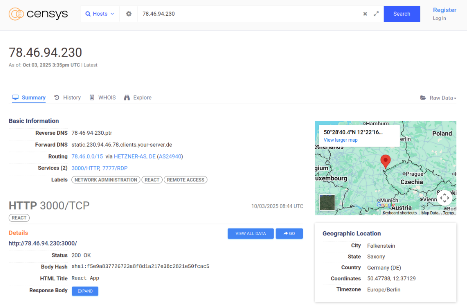 The Blackpoint SOC also observed an additional C2 endpoint at 78.46.94[.]230, which resolved to a VPS hosted by Hetzner Online GmbH in Germany (Figure 19). This second host appears to serve as supplementary infrastructure, indicating the operators maintained more than one exfiltration node across different providers.